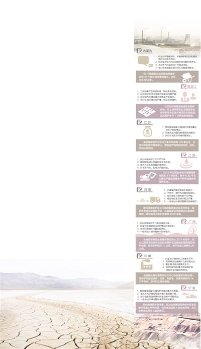 長江江蘇段分布有30個(gè)集中式飲用水水源地,現(xiàn)場抽查12個(gè),8個(gè)存在環(huán)境違法問題;江西省水利廳亂作為,2015年在鄱陽湖批準(zhǔn)3個(gè)采砂區(qū),其中有6.82平方公里位于鄱陽湖銀魚產(chǎn)卵場省級(jí)自然保護(hù)區(qū)內(nèi);河南2015年全省PM10、PM2.5濃度在全國31個(gè)。▍^(qū)、市)排名分別位列第三和第一,2016年上半年,均位列全國第二;2012年至2014年,江西省樂平市政府違反《排污費(fèi)征收使用管理?xiàng)l例》,居然多次用財(cái)政資金為36家企業(yè)代繳排污費(fèi)1147萬元。